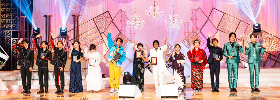 この日はまず、徳久広司会長と若草恵音楽祭実行委員長が幕前で挨拶したあと、第一部の開幕となりました。そして、目覚ましい活躍をしている歌い手に贈る「音楽祭3賞」は、ベストパフォーマンス賞を『Fun! Fun! Fun!』の新浜レオンが、ベストカラオケ賞を『北の恋情歌』の川野夏美が、ロングヒット賞を『部屋とYシャツと私』の平松愛理が受賞し、それぞれ受賞作品を披露しました。また「奨励賞」は、青山新、風輪、LAST FIRST、徳永ゆうきが受賞し、ともに最新曲を披露しました。